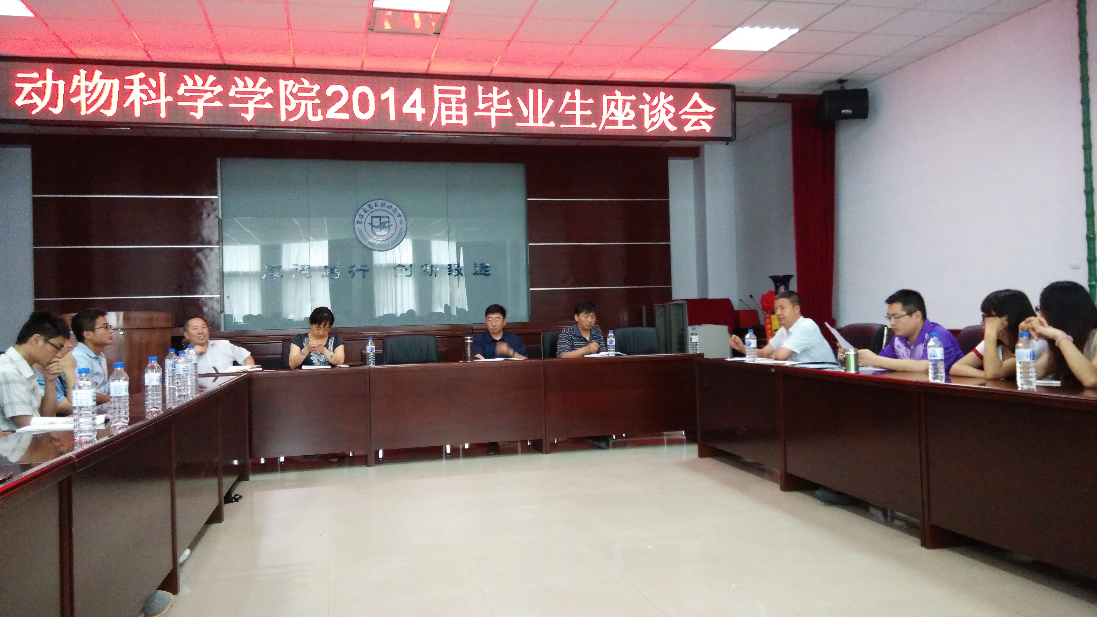 2014年6月23日下午2:00,MILE米乐官方网站2014届毕业生座谈会在学院一楼会议室举行,此次座谈会以“心系动科,共谋学院长足发展”为主题,由学院党委副书记曹伟光主持,院长张嘉保教授,副院长任文陟教授,副院长于景海老师,生物技术系主任逄大欣教授,动物科学系主任沈景林教授,实验动物系党支部书记袁宝老师,各办公室主任、毕业班辅导员及14名优秀毕业生代表均到场参加。