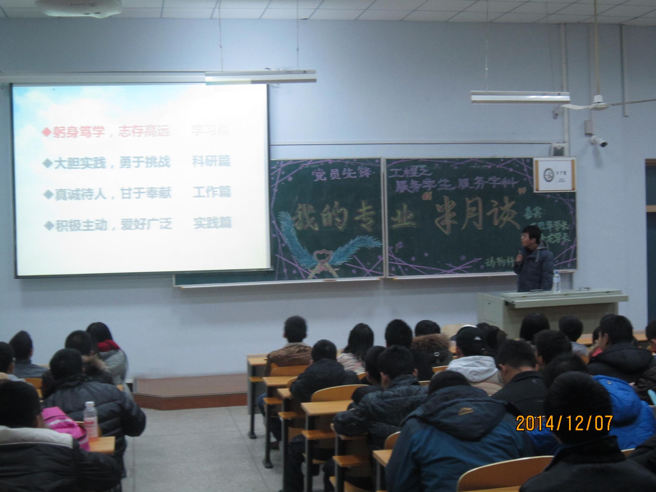 2014年12月7日,周日下午一点半,MILE米乐官方网站2014级全体本科生齐聚科学讲堂100教室,以热烈的掌声欢迎本期嘉宾2011级动物科学专业于兴华、索金龙学长的到来,年级辅导员助理孙宏欣学长也到场参加本次分享。