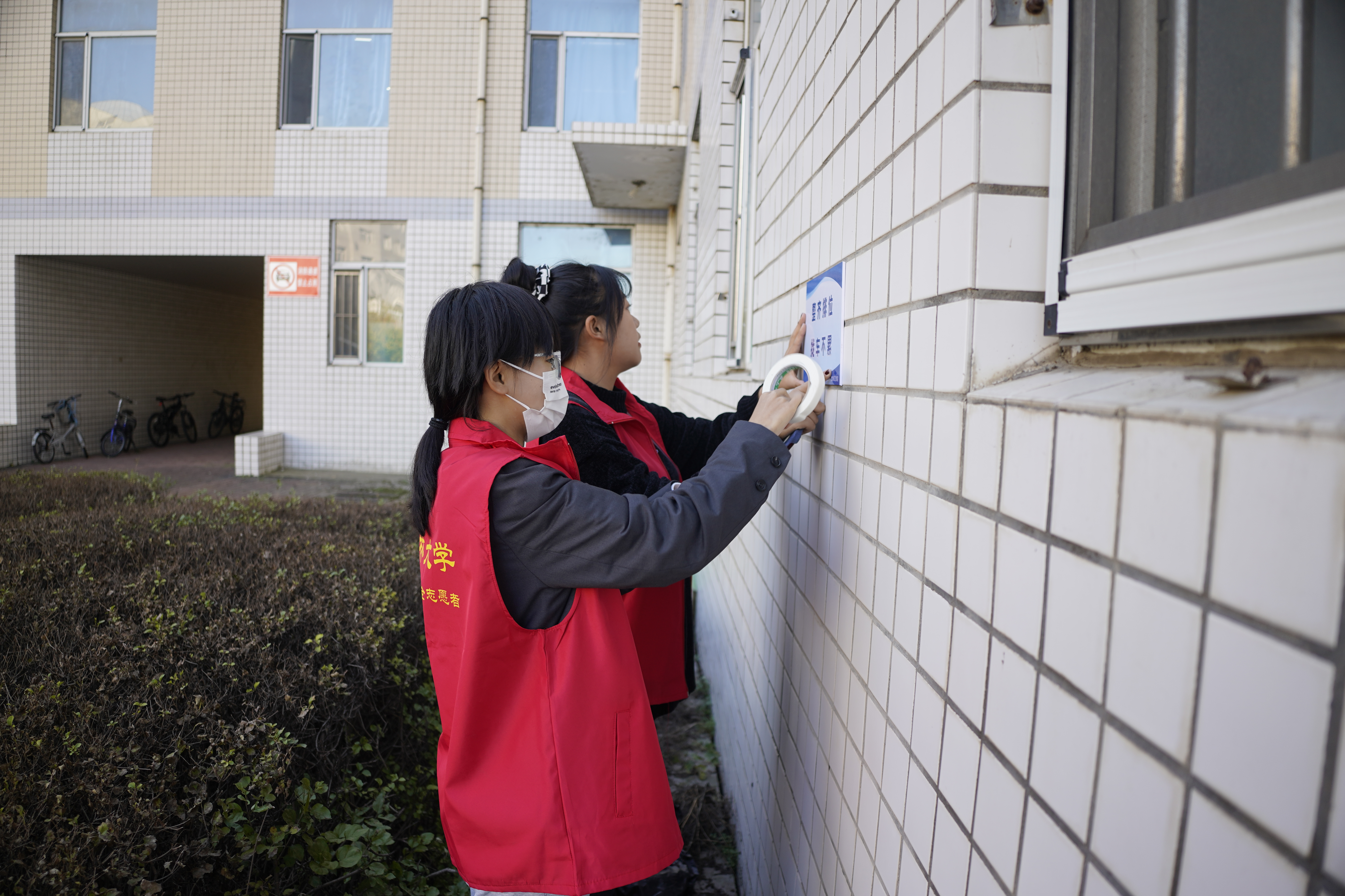 活动期间,我院共组织20余名志愿者分别进行张贴地标警示线、张贴提示语、悬挂横幅等工作,一次性将所有自行车正确归位。一方面,张贴地标警示线可以规划出更大面积的停车区域;另一方面,张贴提示语、悬挂横幅,可以引导同学们合理停放单车。同时,在10月12日、13日连续两天派出若干志愿者进行秩序维护,提醒同学们正确停放自行车。