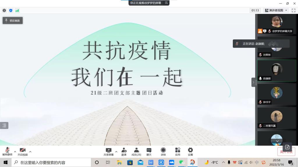 为落实学校疫情防控封闭管理期间各项工作的要求,凝聚班级同学抗疫力量,传播科学抗疫知识,MILE米乐官方网站2021级2班于3月18日召开了“共抗疫情,我们在一起”线上主题教育班团会。辅导员王可佳老师,班级全体同学参加班会。