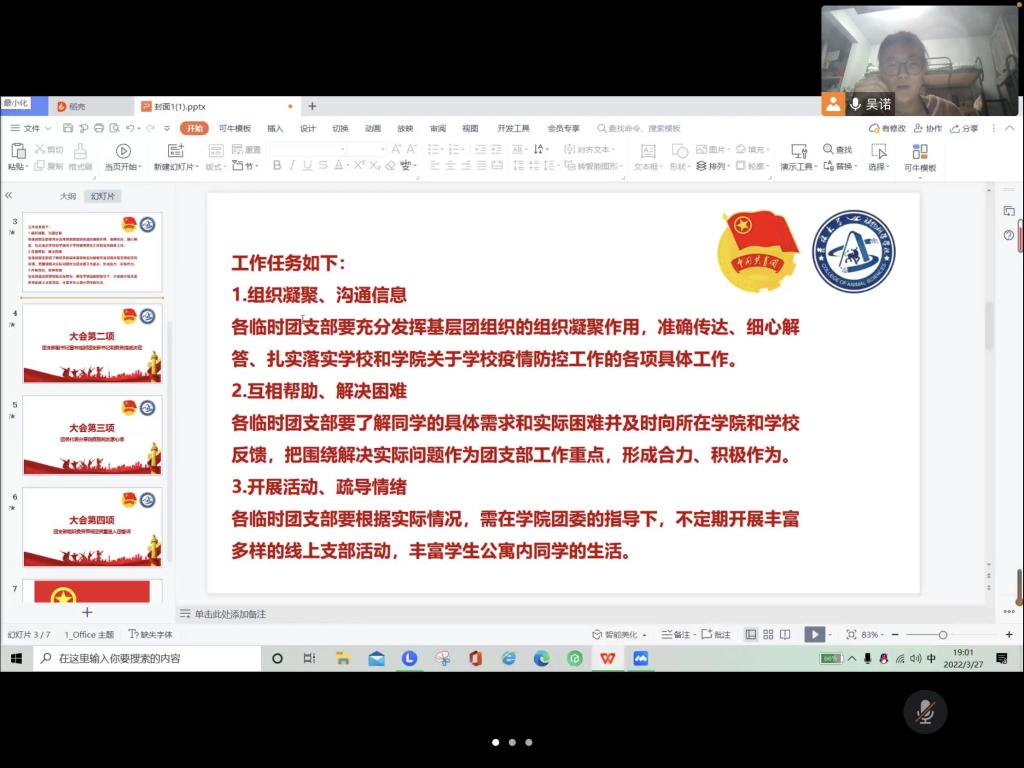会议指出,新成立的临时团支部工作任务包括组织凝聚、沟通信息,互相帮助、解决困难,开展活动、疏导情绪,辅助校工作人员和志愿者防疫抗疫工作,疏导封校时期全体学生的心理情绪。会议提出了临时团支部工作任务的三“要”:临时团支部要充分发挥基层团组织的组织凝聚作用,准确传达、细心解答、扎实落实学校和学院关于学校疫情防控工作的各项具体工作;要了解同学的具体需求和实际困难并及时向所在学院和学校反馈,把围绕解决实际问题作为团支部工作重点,形成合力、积极作为;要根据实际情况,需在学院团委的指导下,不定期开展丰富多样的线上支部活动,丰富学生公寓内同学的生活。
