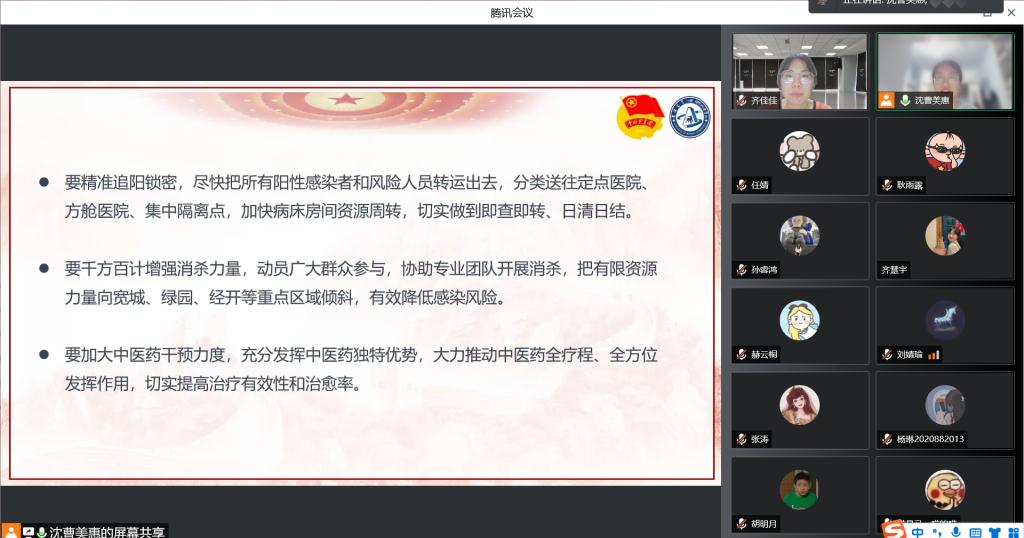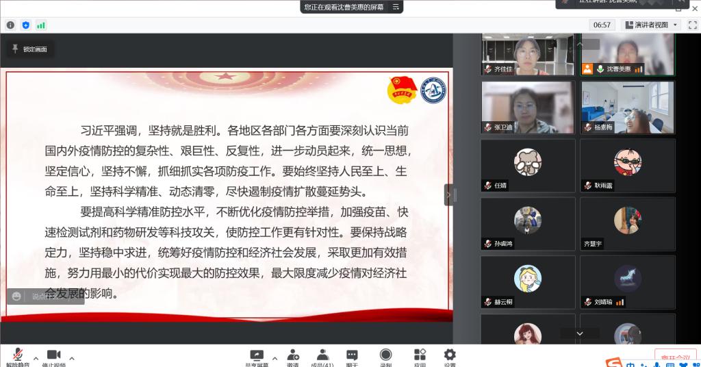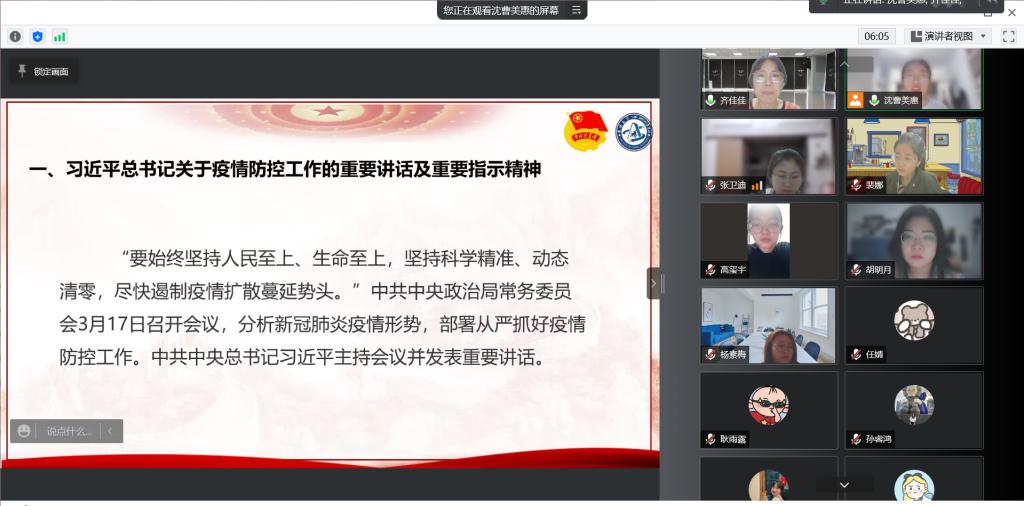 2022年初,一场突如其来的疫情打乱了原本的校园生活秩序。在全面封控的形势下,为坚定共青团员万众一心、共同抗“疫”的理想信念,培养爱党爱团的家国情怀,学习贯彻习近平总书记关于疫情防控工作的重要讲话精神,MILE米乐官方网站第十一临时团支部于4月8日晚20点开展“喜迎十二大,永远跟党走,奋进新征程”为主题团日活动。本次团课活动借助腾讯会议,以线上形式开展,会议由团支书沈曹美惠主持,支部全体成员参加。