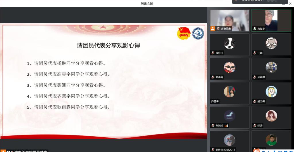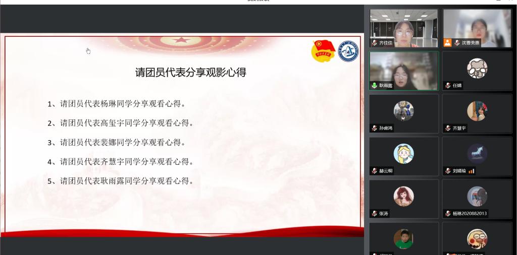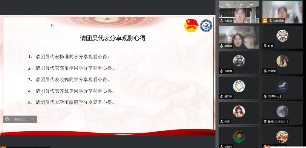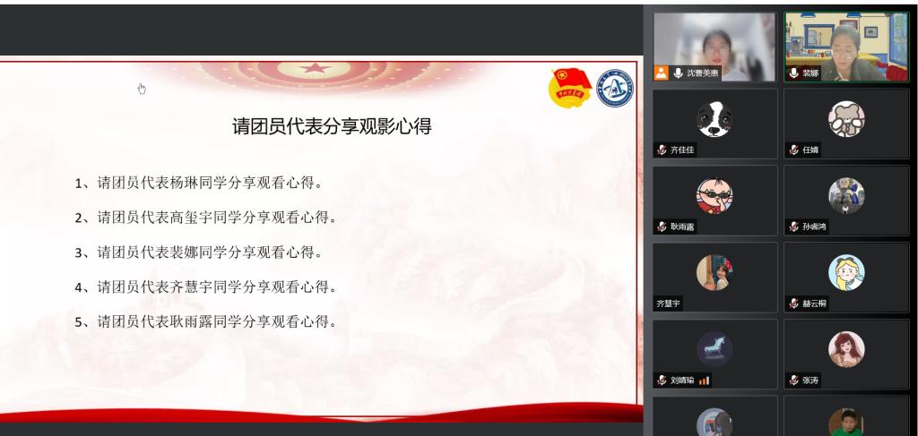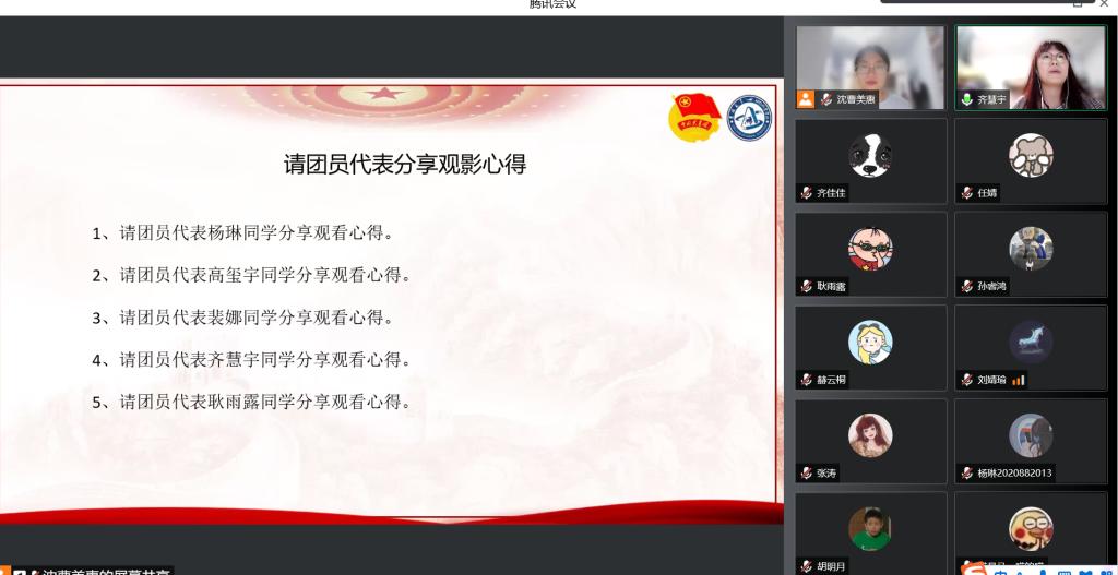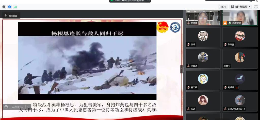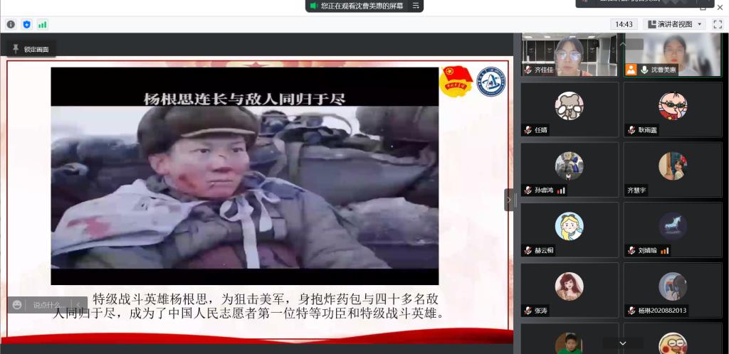 为深入开展爱国主义教育活动,进一步支部同学对党光荣发展历史的认识,2022年4月8日下午19:30,MILE米乐官方网站第十一临时团支部依托腾讯会议组织开展了“观看红色影视作品”之分享《白山黑水铸英魂》、《跨过鸭绿江》、《人世间》等影视活动。团支部全体团员积极参与本次活动。