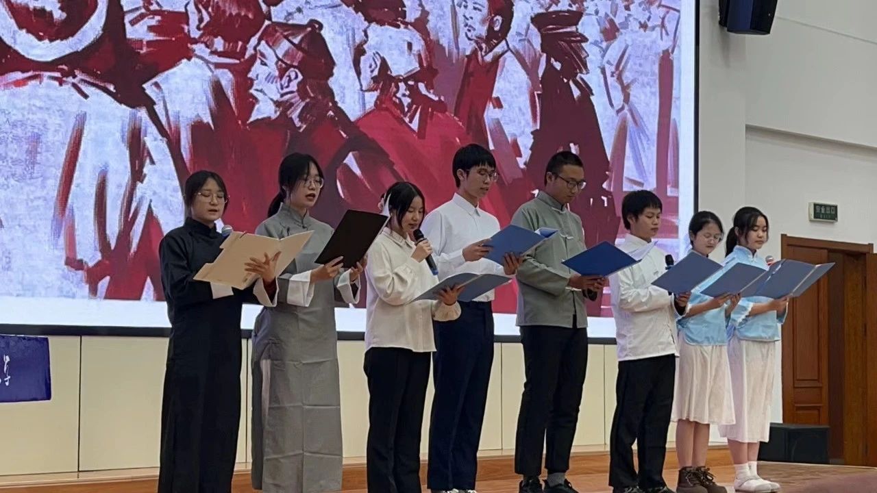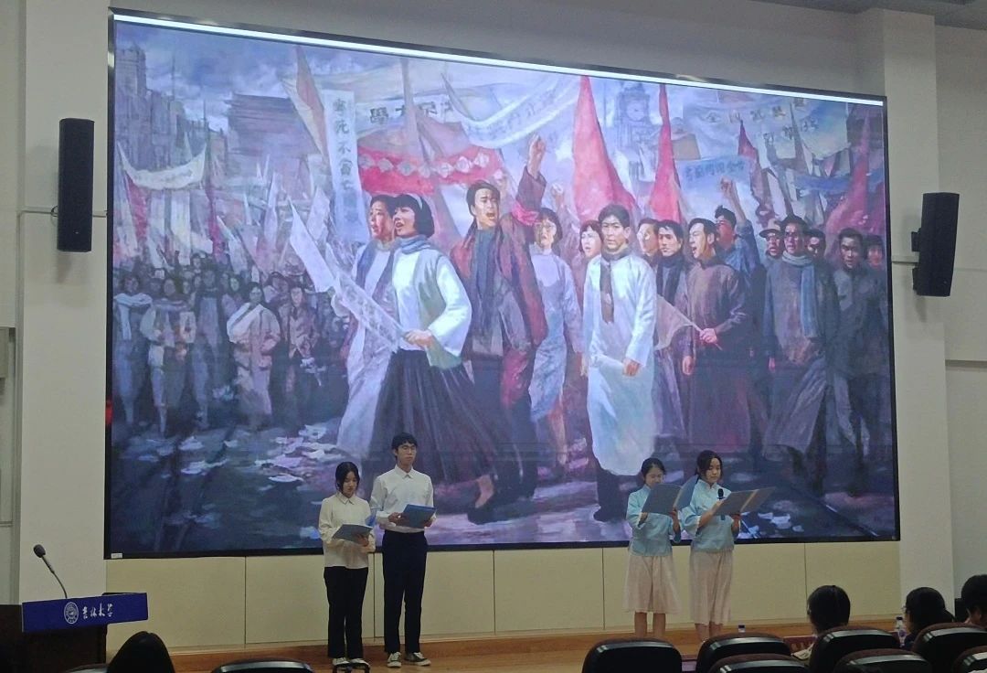 诗朗诵短剧《此生为契,濯中国辉煌》以一二·九抗日救亡运动为历史背景,将诗歌朗诵和舞台剧表演相结合,重现了1935年12月9日北平爱国学生参加抗日救国请愿游行时涌上街头的场景,节目现场掌声连连,气氛热烈。