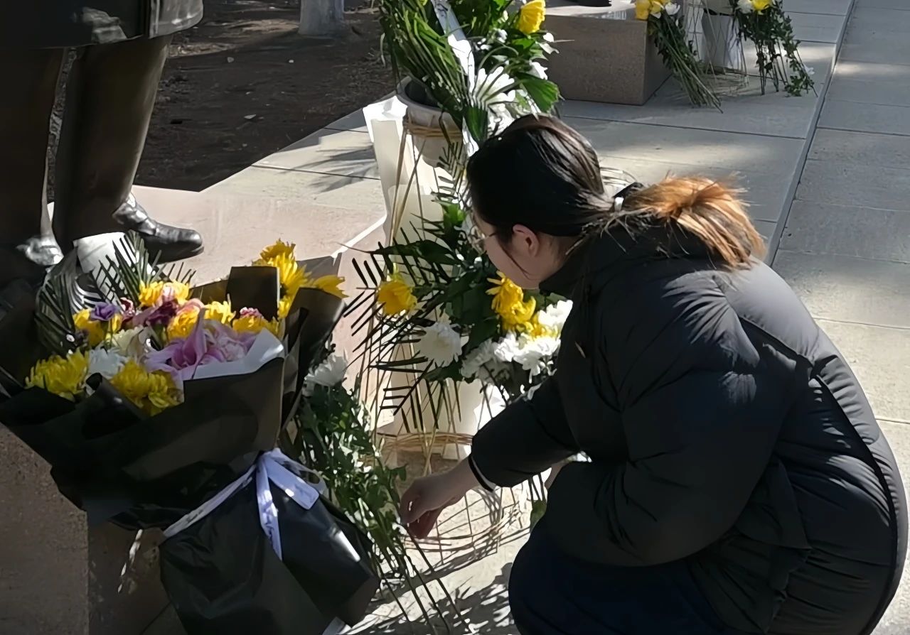 随后,全体师生依次向先贤敬献鲜花后,默哀一分钟。