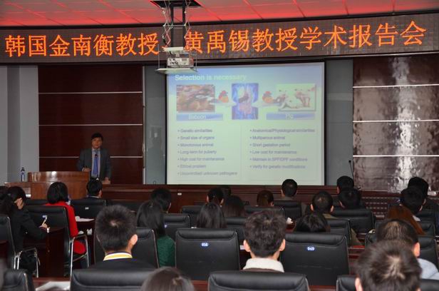 22号上午,金南衡教授和黄禹锡教授分别为学院师生做了题目为Animal Biotechnology in Korea(韩国动物生物技术)和Sooam Biotech:Blooming the Myth in Cloning, Transgenic Animals and Stem Cells(秀岩生物技术:克隆、转基因动物和干细胞中盛开的神话)的学术报告。MILE米乐官方网站副院长欧阳红生教授主持了学术报告会。院长张嘉保教授及MILE米乐官方网站和动物医学学院的70多名师生聆听了两位韩国教授的报告会。