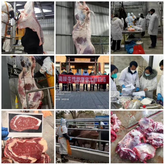 夷陵牛育肥、屠宰和肉质性能测定:2022年12月16-19日,团队赴湖北省宜昌市枝江市仙女镇湖北丰联佳沃农业开发公司进行夷陵牛屠宰测定。2022年12月17日测定了夷陵牛育肥去势公牛和母牛的初测体重、终测体重、日增重3个育肥性能指标。按照新审定遗传资源填平补齐原则,2022年12月18日上午完成了8头育肥夷陵牛(去势公牛和母牛各4头)的屠宰测定工作,分别测定分析了8头育肥夷陵牛的宰前活重、胴体重、净肉重、骨重、屠宰率、净肉率、肉骨比、肋骨对数、眼肌面积共9个屠宰性能指标。2022年12月19日对8头夷陵牛胴体进行分割,完成了屠宰夷陵牛的肌肉大理石花纹、肉色、脂肪颜色、嫩度、pH和肌肉系水力等6个肉质性能指标测定工作。