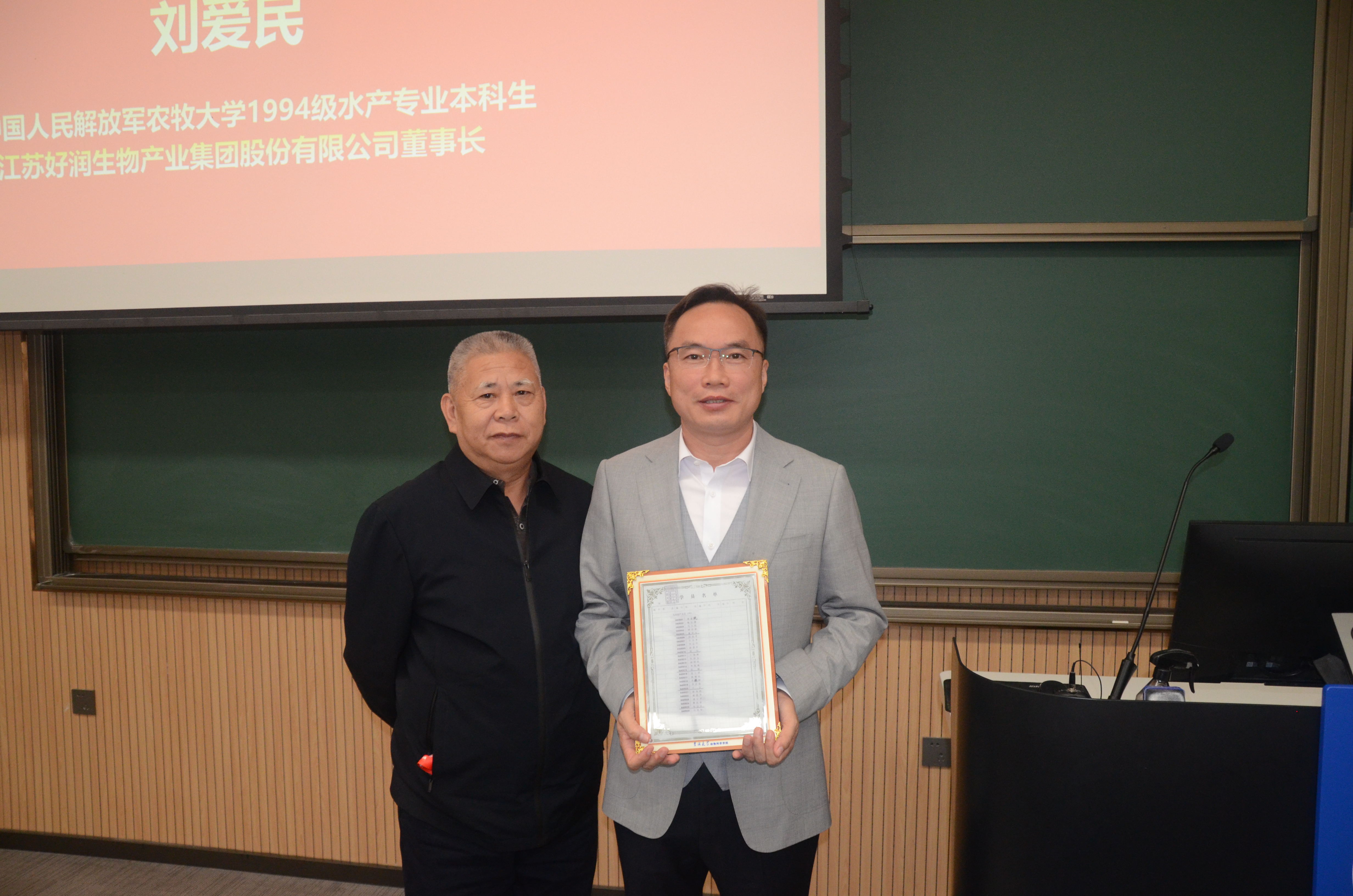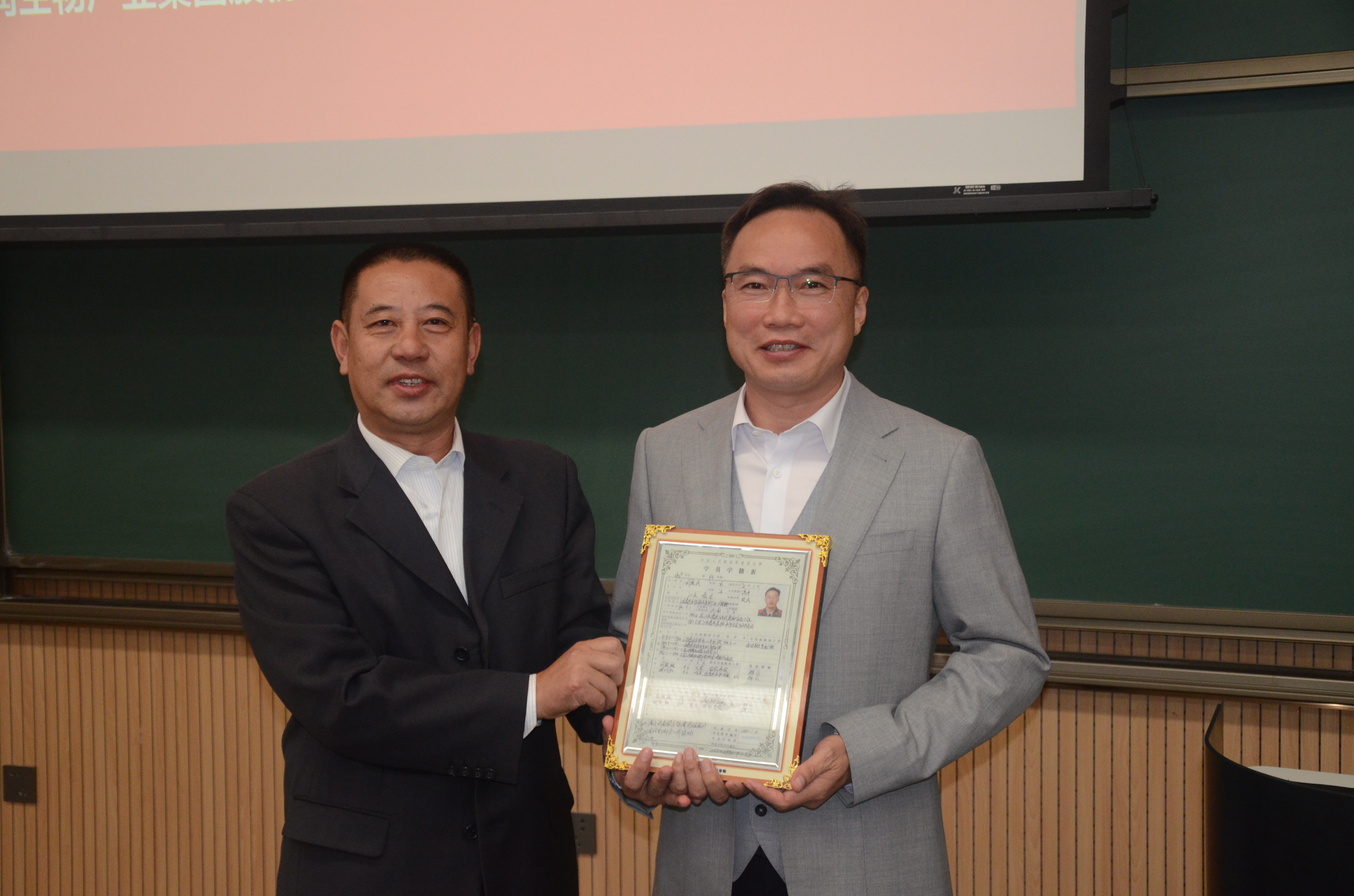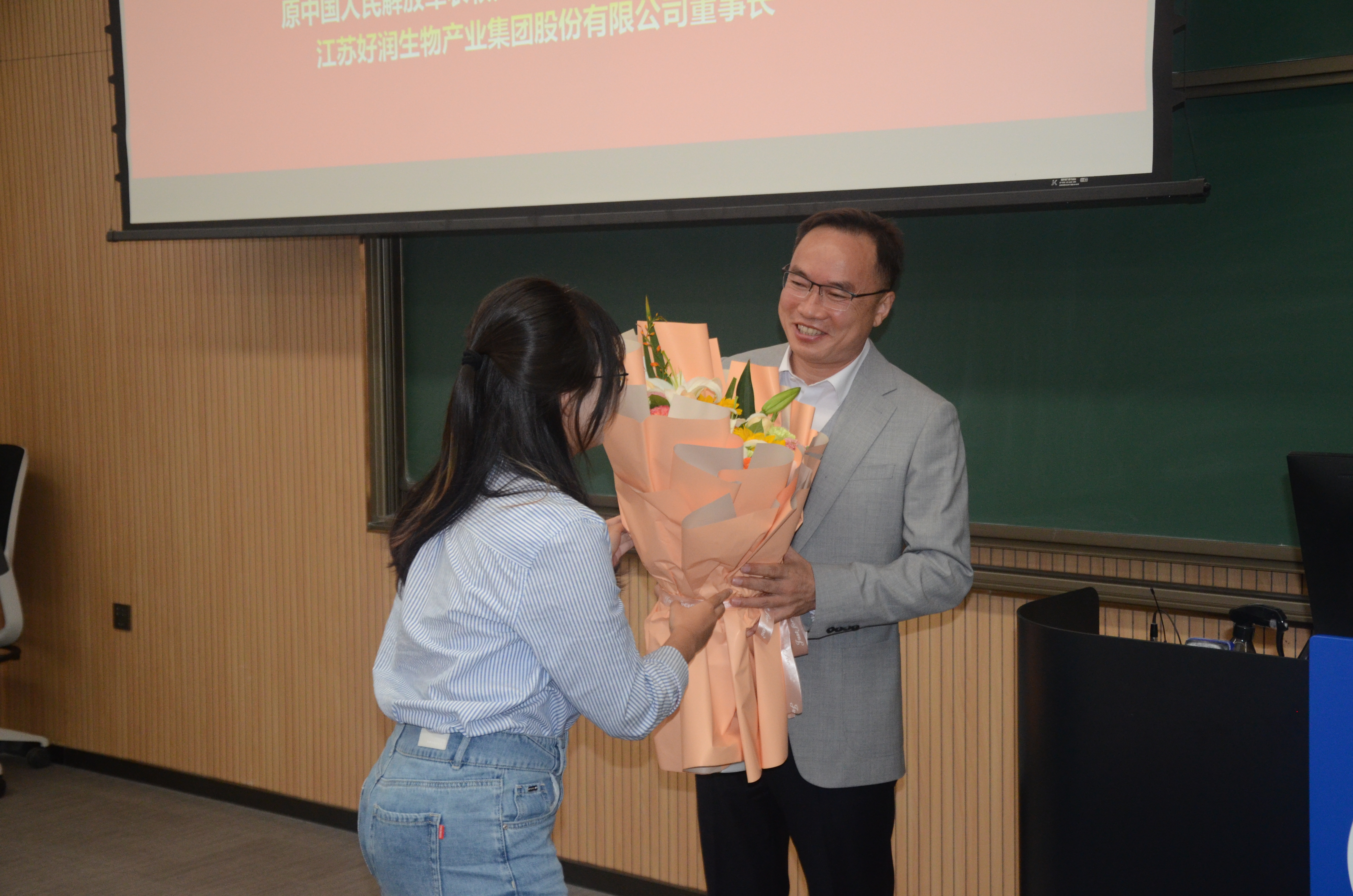 报告结束后,高福和、张晓楼为刘爱民校友颁发学院为其精心准备的纪念品-刘爱民校友在军校读书时的“学籍表”“花名册”,学生代表为刘爱民校友献上鲜花。