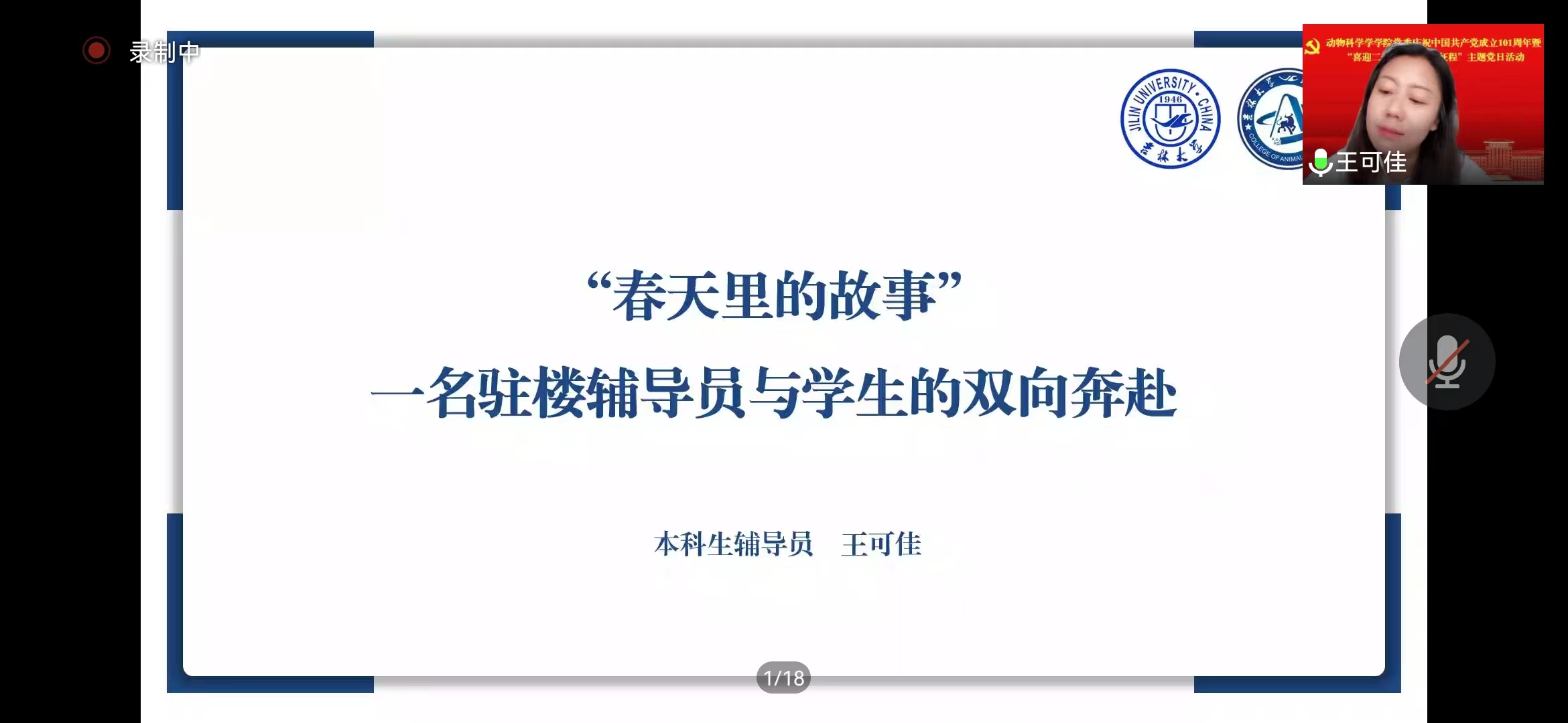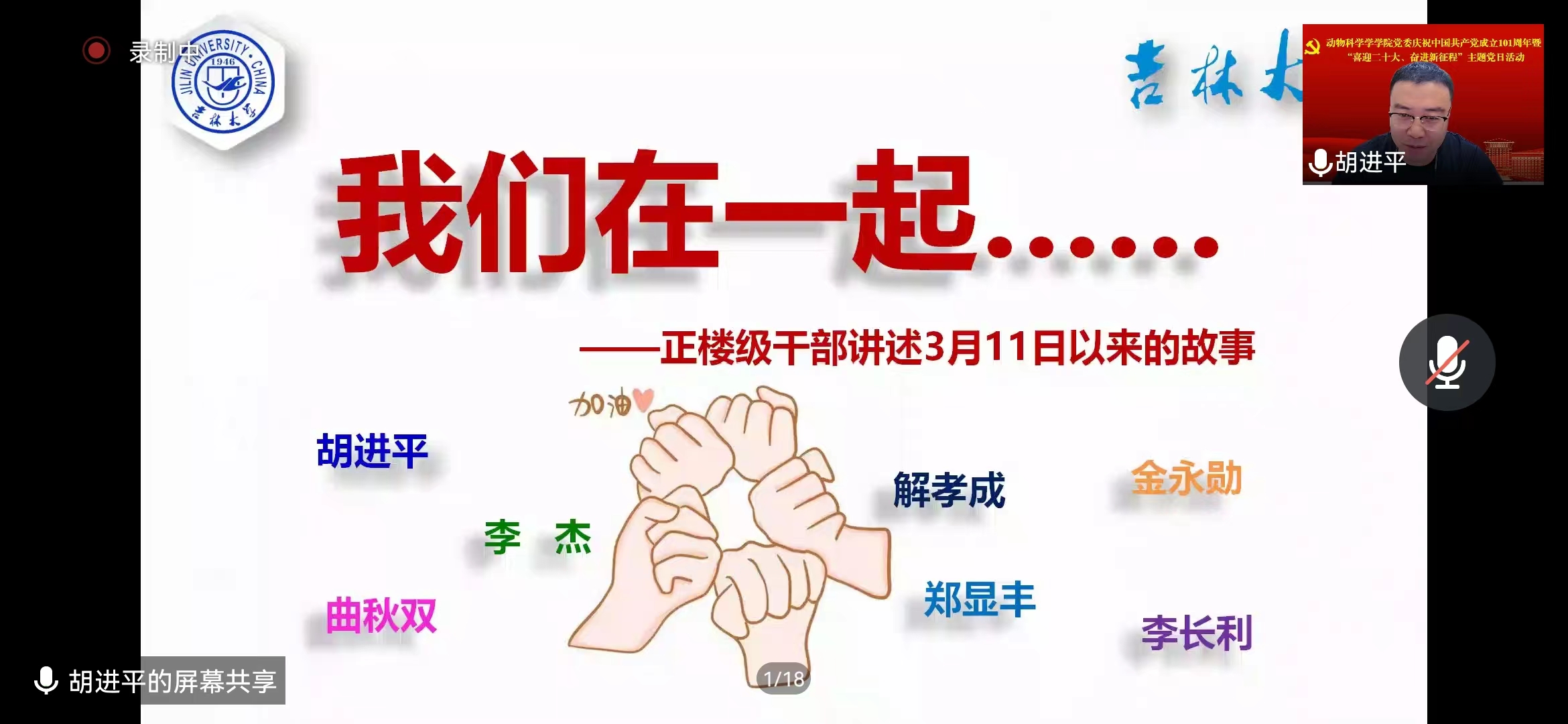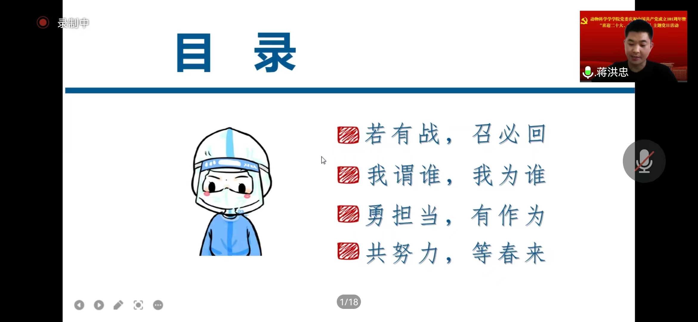 随后,学院疫情防控一线教职工党员代表肖建荣、王可佳、蒋洪忠和胡进平4位同志联合开展“党课开讲啦”,用生动的图片和鲜活的事例分享了他们在校园疫情防控和生产一线工作中的感人故事。肖建荣副书记以《回望·感动·力量·笃行》为题,分享了她带病上阵,在校园防疫一线担任52天“楼长”的感动与收获;辅导员王可佳以“春天里的故事”为题讲述了驻校时间最长、岗位变化最多的楼长与她学生们的双向奔赴;蒋洪忠老师用朴实却坚定的语言生动诠释了“召之能战、战之必胜”的“军人本色”;胡进平老师则细数学院生产一线的7位同志从冰雪覆盖到春暖花开再到夏日到来一路的艰辛与坚守......讲不完的故事,道不尽的感动,4位党员同志用他们的实际行动为学院师生筑起一道坚强的防疫屏障,他们是校园防疫一线的一抹“动科红”。