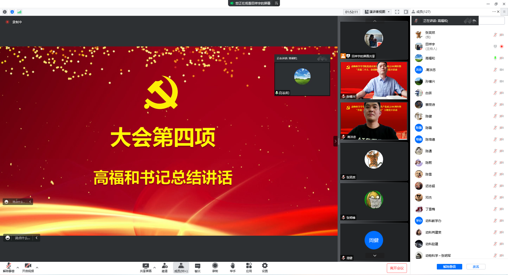 最后,党委书记高福和同志发表总结讲话。他分别用“累”、“守护”、“能”和“苦”评价了4位党课主讲人同时,他也代表学院党委向4位坚守一线的党员和学院广大志愿者们表示了感谢和敬意。他号召全体师生向他们学习,一是要学习他们越是艰险越向前的忘我精神;二是学习他们召之即来来之能战的无畏精神;三是要学习他们坚守忍耐,默默奉献的无私精神;四要学习他们听从组织召唤的大局意识。高书记强调,全体师生要将今天的感动化为今后工作的不竭动力,持续弘扬伟大的抗疫精神,让党旗永远飘扬在学院教学科研和人才培养的第一线,充分发挥党员先锋模范作用,助力学院建设与发展,以更加优异的成绩,我们党的二十大胜利召开献礼。